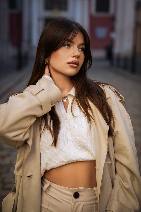 To była bardzo spokojna, prosta sesja w centrum Poznania, złapana w świetle zachodzącego słońca. Bez kombinowania, bez scenografii — tylko Wiktoria, miasto i to miękkie światło, które robi ogromną robotę.